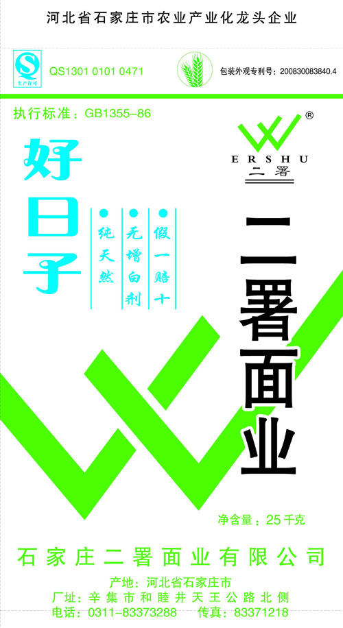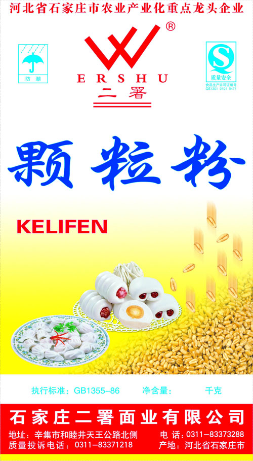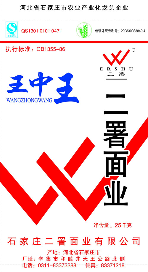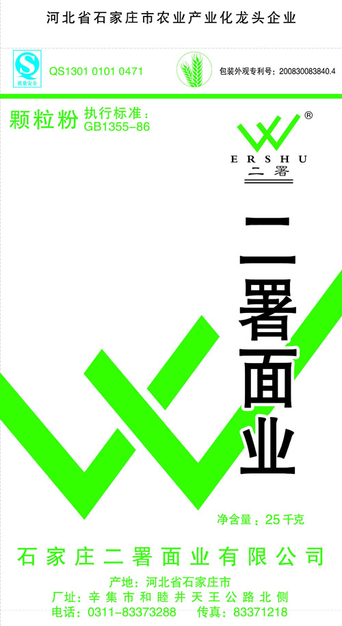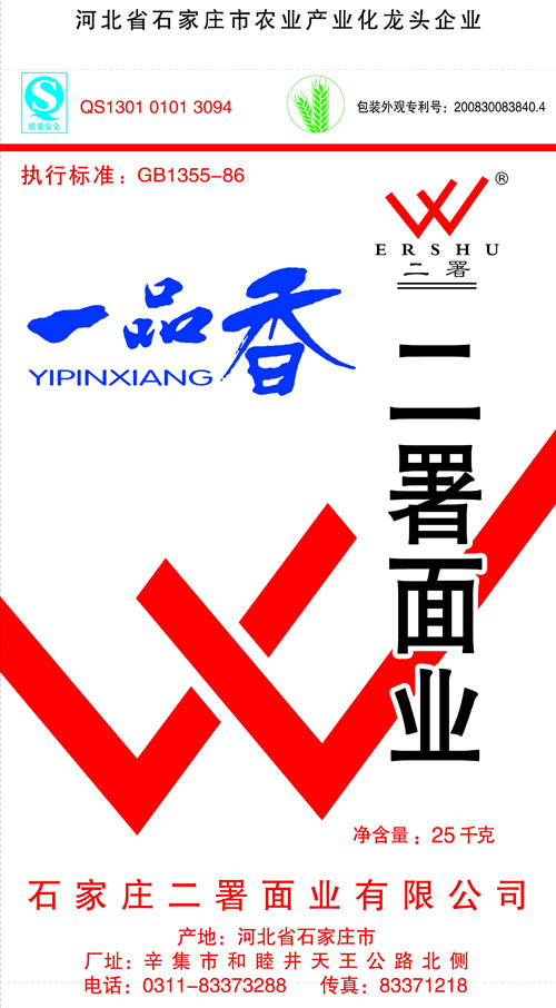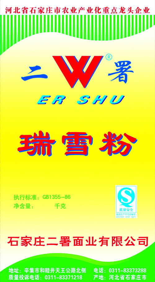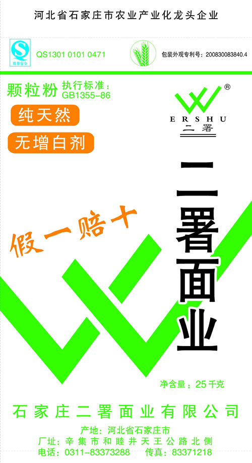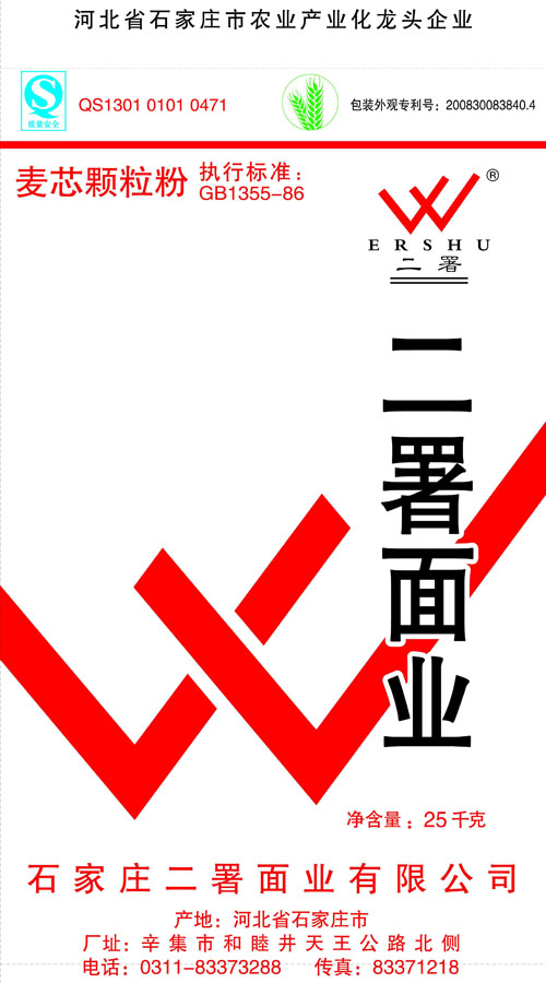 河北面業(yè)         二署面業(yè)有限公司創(chuàng)建于1989年,現(xiàn)已具備日處理小麥300噸的能量,產(chǎn)品質(zhì)量穩(wěn)定,深受客戶青睞。 二署面業(yè)地理位置優(yōu)越,北靠307國道石黃高速,南鄰石德鐵路,衡井國道,交通十分方便,為貨物運(yùn)輸提供保證及時運(yùn)輸?shù)奶烊粭l件。產(chǎn)品運(yùn)銷:黑龍江、吉林、遼寧、河北、內(nèi)蒙、陜西、山西等大中省份,贏得了廣大消費(fèi)者的認(rèn)可。 河北面業(yè)